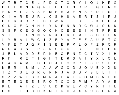 Find words that describe rescue workers, their tools and safety items printed in the word search above. They can be upside down, backwards, forwards or diagonal.