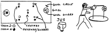 Rules: Centers face off in center of field; touch ground with scoops on each side of ball raise scoops once over ball touching others scoop then back to ground. Then each boy tries to scoop up the ball and throw it to another team member who must catch it with his scoop then pass it on, or try to make a goal past goalie and between goal posts. Goalie tries to divert ball from goal using scoop or body (no hands). Goal counts one point. If a player touches the ball with his hand the other team gets possession at point of infraction. Players may go anywhere on field except goal circle. Goalie moves freely inside goal circle. Last team to touch out of bounds ball loses possession. Body contact is not allowed and disputes over possession are settled at point of conflict with a face off between the 2 players involved. First team to score 5 points, wins.
