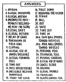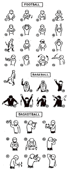Each Den member gets a piece of paper and a pencil when he arrives. The chart of official sports signals (below) is displayed for everyone to see. (Or you could reproduce them on each boy’s paper.) The object is to have each person list the meanings of the various signals. Answers can be given at the meeting’s end.