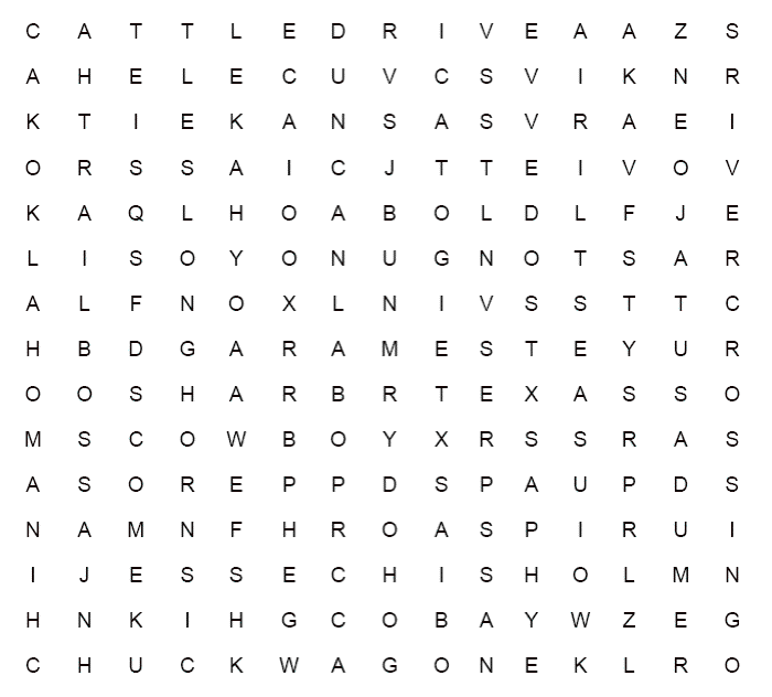 Answers:           1-SPURS, 2-SADDLE, 3-HORSE, 4-BUFFALO, 5-COWBOY, 6-LASSO, 7-STEER, 8-RODEO, 9-CHAPS, 10-BURRO, 11-HOLSTER, 12-RIFLE, 13-BRIDLE, 14-CABIN