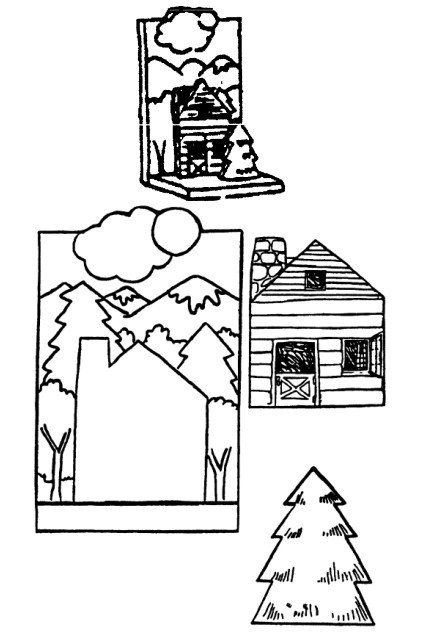 Using 3/4" wood, cut one back 4" x 6", one base 3" x 4", one cabin and one tree for each bookend. See pattern pieces