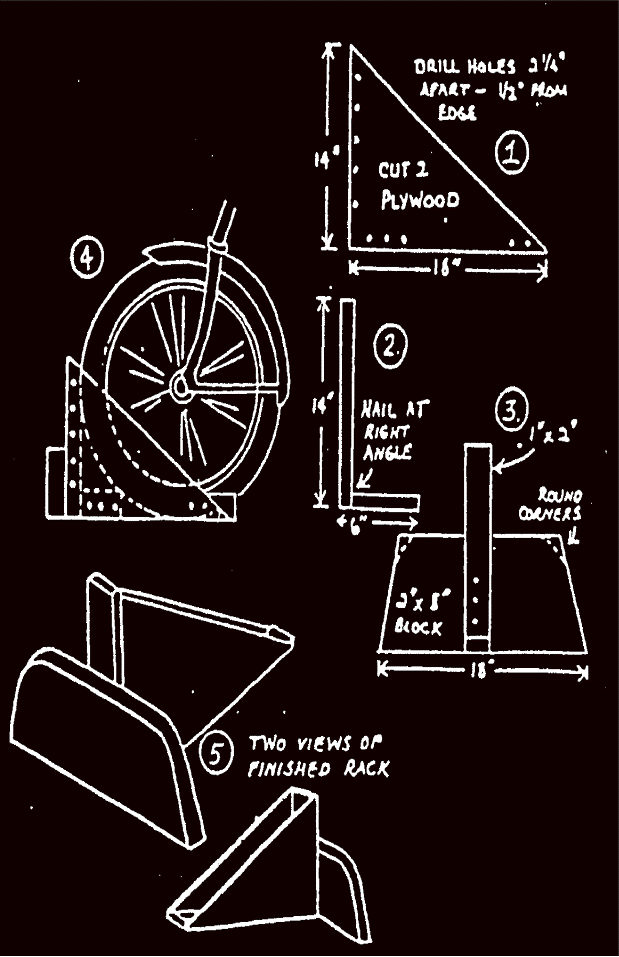 - Cut plywood triangles. Drill holes as show with a 5(32" drill bit. Paint or varnish the inside of plywood at this time. It will be difficult to do after rack is assembled.