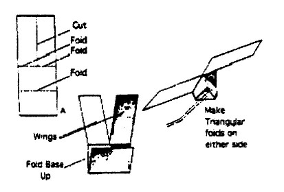 - Using a piece of paper 3 ½" wide by 8 ¼” long, cut down the center of the paper 4" and then fold the cut sections to opposite sides as shown, to form the two wings.