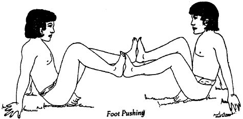 - Each player pushes his feet against the other player's feet. A player can push straight ahead so that the other player is moved backwards. Or he can try to push the other player's feet to the right or left side.