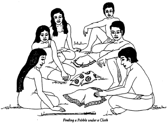 - The person to hide the stone holds it in his hand so that no me can see it. Then he lifts the edge of one of the pieces of cloth and puts his hand under it. He does this with each piece of cloth. He drops the stone under one of the pieces of cloth, but he tries hard not to let the people on the other team know which cloth has the stone under it.