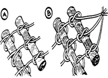 Now tie each tube, one by one, to the ropes. Tie over and under knots, leaving 2” to 3” between each tube (A). Remember to leave at least 3 feet at the end of each rope so you can hang up the hammock.