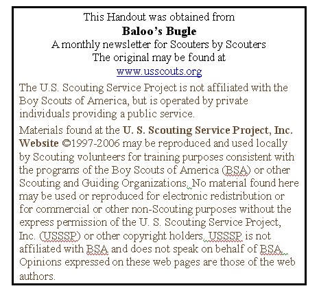Materials found at the U. S. Scouting Service Project, Inc. Website ©1997-2007 may be reproduced and used locally by Scouting volunteers for training purposes consistent with the programs of the Boy Scouts of America (BSA) or other Scouting and Guiding Organizations. No material found here may be used or reproduced for electronic redistribution or for commercial or other non-Scouting purposes without the express permission of the U. S. Scouting Service Project, Inc. (USSSP) or other copyright holders. USSSP is not affiliated with BSA and does not speak on behalf of BSA. Opinions expressed on these web pages are those of the web authors.