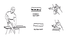 Handsaws have come a long way since the earliest Stone Age man made his by chipping notches in a piece of stone or flint. Todays saws are made of steel, with handles designed for a firm grip and with tow different types of teeth. These two very important saws in a wood worker's tool kit are a rip and a crosscut saw. While both saws look alike in size and shape, a close examination of the teeth will disclose several differences - the shape and spacing of the teeth, and the way the teeth are filed. Rip-saw teeth are designed to cut with the grain of the wood and so are straight-filed, each tooth cutting as a small chisel. Crosscut saw teeth are designed to cut across the grain and so are bevel-filed, each tooth cutting the wood fibers like a sharp knife. Both saws have a "set" in the teeth ... that is, alternate teeth are bent outward slightly, so the saw serf will be slightly wider than the thickness of the blade to provide clearance and make cutting easier.