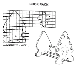 It also helps to keep your room in order. Making this book rack is not difficult and is a good woodworking project. The end boards of the rack are cut out in the shape of a huge Indian arrowhead. See template for pattern. These are cut from one-half inch hardwood.