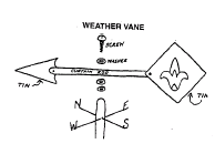 - Using patterns enlarged from the above illustrations, cut arrowhead, Webelos insignia and compass point initials from tin. Roll edges so they will not be sharp and dangerous.