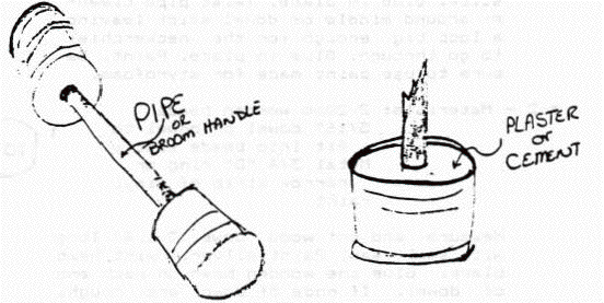 Barbells can be made of plaster set in cans with short length of pipe or broom handle in between for a hand weight or long piece of pipe or broom handle for a regular set of barbells. Judge the size of cans and pipe or stick by the size of scout that will be using them.