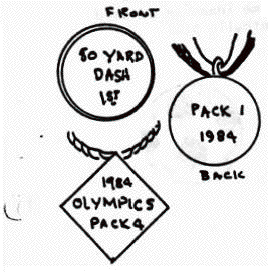 Diamond shape medals can be cut from cardboard or foil pans, and colored or imprinted with marking pens. When using the foil pans, tool the lettering first with a ballpoint pen, then fill in with permanent markers. These medals can also be attached to a ribbon for wearing around the neck.
