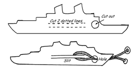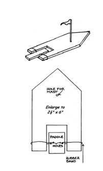 rear as shown. Tape rudder in place. Place blown up balloon in boat and watch it