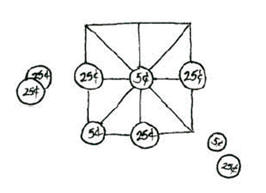 played with coins, five each of two different denominations such as nickels and