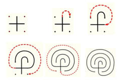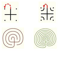 Want to make a right-turning labyrinth?  Just reverse these steps on the three-circuit (on the left below) or the seven-circuit (on the right below) By reversing these steps and all the rest of the lines, you will have made a right-turning labyrinth.