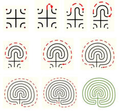 Usually, a labyrinth has only one path to a center destination, with nothing to hide the destination – people use a labyrinth to meditate or do creative thinking.   Usually, people actually walk along a labyrinth, but they can also “walk” using their fingers on a labyrinth pattern on paper.