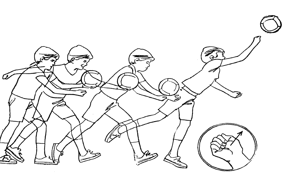 Keep your eyes on the ball. Bring right hand down, back, and up behind you. Step a quarter step forward on your left foot. Swing your right hand at ball. Just before you hit it, toss the ball up a little and drop your left hand away from it. (The rules say – release your left hand from the ball before hitting it.) Strike ball solidly with the palm side of your fist and follow through. (Of left handed, reverse from right to left.)