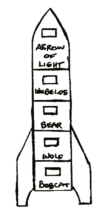 Arrangements: Ceremony board resembles chart of Sun and planets with Cub as the Sun and Cub ranks as planets. A small blue and yellow cardboard rocket should be made for each Cub getting a badge and placed on or under his rank. If a loop of masking tape is placed on the back of each rocket, the rocket can be moved by the Cubmaster to the new rank as the parents are presenting the badge. (Use Cub Scout insignia stickers.)