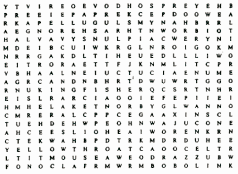 Flocking together in this puzzle are 68 different kinds of birds. Pick up your bird watching binoculars and you may spot them reading up, down, forward, backward, or diagonally. Try your luck at bird watching!!