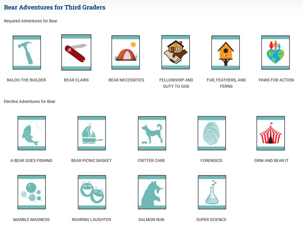 Third graders work toward the Bear rank. The Bear rank is earned by completing seven adventures as described below.