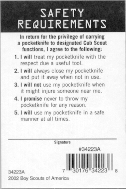 The Pocketknife Pledge:In return for the privilege of carrying a pocketknife to designated Cub Scout functions, I agree to the following: