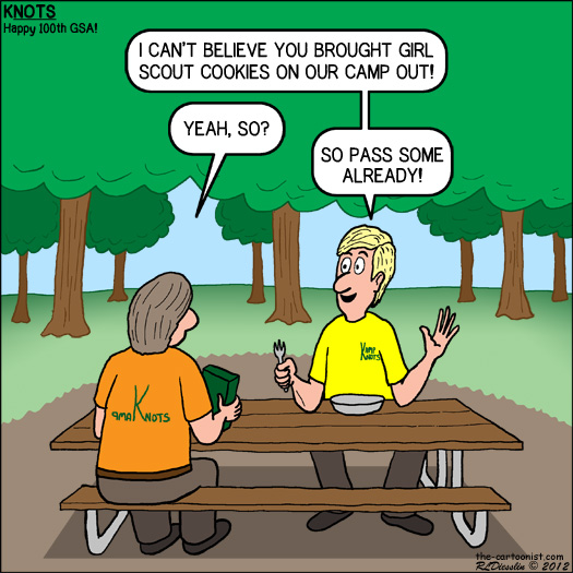 Copyright ©2012 Richard Diesslin, all rights reserved. This image is copyright protected and may not be used or reproduced in any form without the expressed written permission of the owner.  Permission is usually granted for local troop/pack hardcopy newsletter use, but you need to ask (it's free)! Higher resolution images (color and black-and-white) and permissions are available with purchase of the KNOTS CD. Also the KNOTS Book and/or e-Book may be of interest! Licensing rights are also available for purchase. Thanks for your interest in KNOTS cartoons and your respect for our copyrights. Note: KNOTS Cartoons are not affiliated with the Boy Scouts of America. KNOTS Home | Cool Stuff